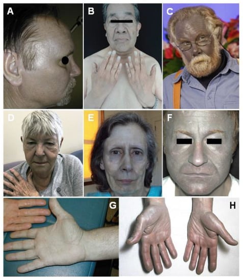 Slika 3: Primeri modro-sivega obarvanja kože, ki nastane zaradi kopičenja srebra v tkivih (argirija). Zgoraj desno (C) je prikazana močno obarvana koža Paula Karasona.