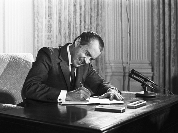 Slika 4: Takratni ameriški predsednik Richard Nixon leta 1971 podpisuje zvezni zakon (National Cancer Act), ki je omogočil financiranje rekordnih 1,6 milijarde dolarjev v naslednjih treh letih.
