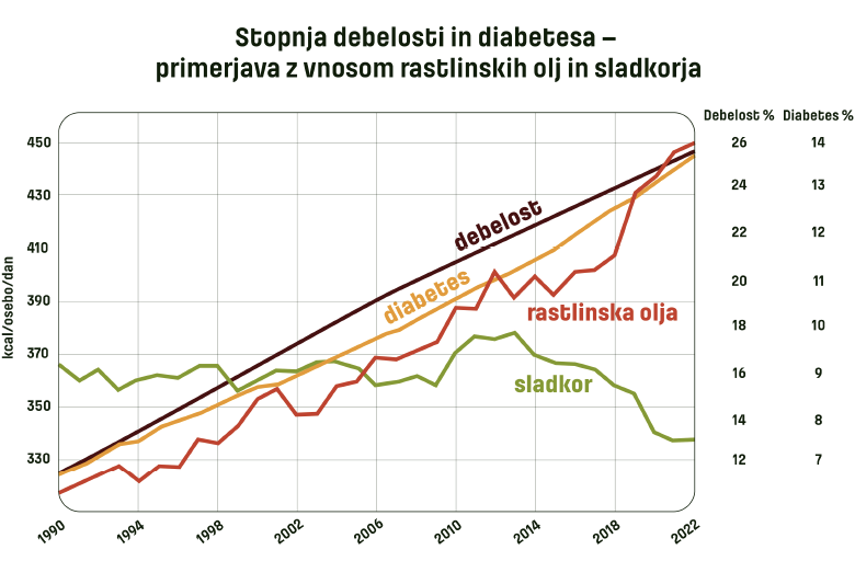 Kot je razvidno iz zgornjega grafa, debelost in diabetes (sladkorna bolezen) naraščata vzporedno s povečano porabo industrijskih rastlinskih olj. Čeprav za ti težavi pogosto krivimo sladkor, je njegova poraba dolga leta ostajala enaka, po letu 2013 pa je celo pričela upadati. Podatki torej kažejo, da glavni krivec za izrazit porast bolezni morda ni sladkor, temveč prav nestabilna olja iz semen.