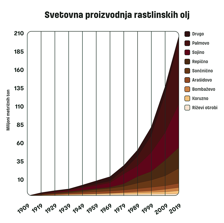 Grafikon 2: Svetovna proizvodnja rastlinskih olj je že več kot stoletje v eksponentnem porastu, ki mu ni videti konca, saj ostaja najhitreje rastoči podsektor globalnega kmetijstva. Danes polja, namenjena pridelavi rastlinskih olj, zavzemajo več površin kot vsi nasadi sadja, zelenjave, stročnic, oreščkov in gomoljnic skupaj.