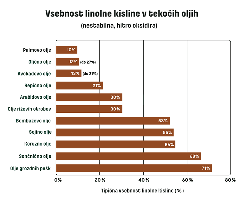 Grafikon 3: Vsebnost škodljive linolne kisline (omega-6) v rastlinskih oljih. Olja, pridobljena iz sadja (oljčno, avokadovo, palmovo), vsebujejo bistveno manj linolne kisline kot olja iz semen in so zato kemijsko stabilnejša.