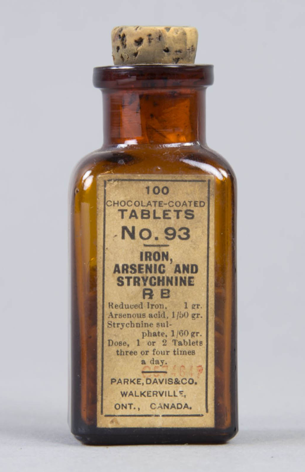 Slika 1: V 1920-ih so tablete z železom, arzenom in strihninom obložili s čokolado, da so jih ljudje lažje pogoltnili. Poleg arzena je bil takrat priljubljen tudi strihnin, saj je povzročal občutek mravljinčenja, kar je ljudi prepričalo, da "zdravilo" deluje. Danes vemo, da je šlo pravzaprav za začasno ohromitev, saj je strihnin močan živčni strup. Vir: