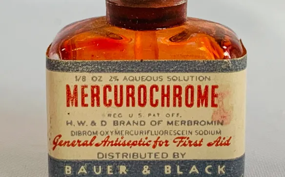Slika 2: Steklenička merbromina, živosrebrove spojine izrazito rdeče barve, ki je bila dolga leta v uporabi kot razkužilo. Ponekod se v ta namen uporablja še danes. Vir: