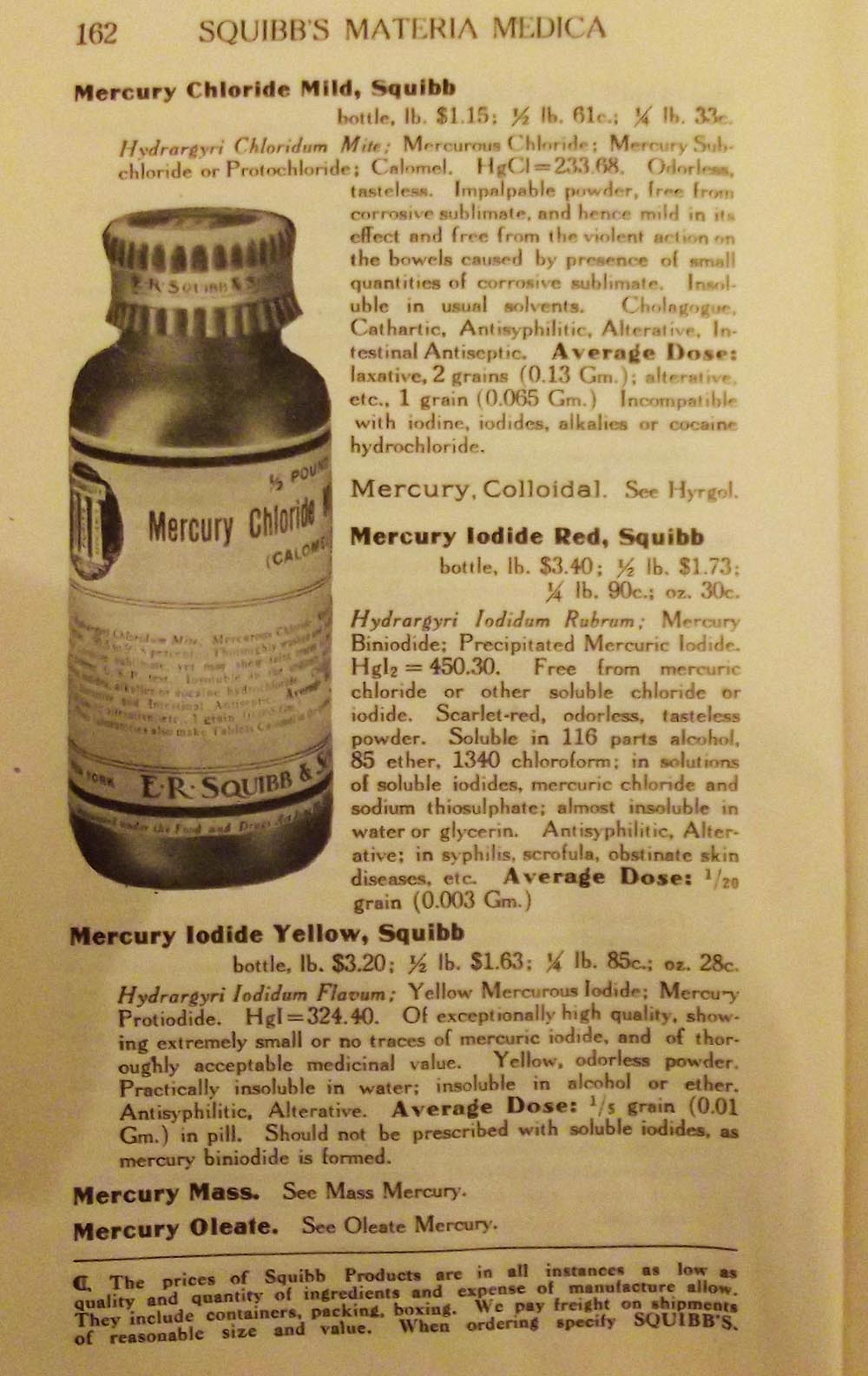 Slika 4: Živosrebrove spojine so se uporabljale za zdravljenje sifilisa, kožnih bolezni in kot "črevesni antiseptik". Tudi koloidno živo srebro naj bi imelo odlične zdravilne sposobnosti in še leta 1934 so ga opisovali kot razmeroma varnega.